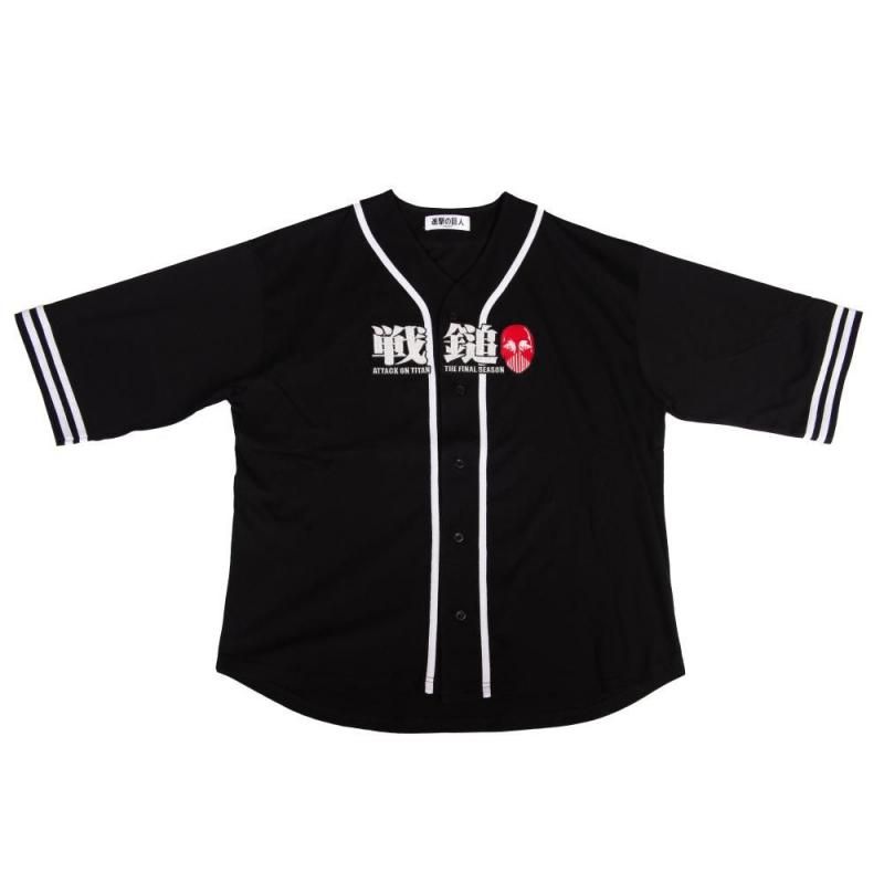 前面には「戦鎚」の文字とともに、タイトルロゴと戦槌の巨人のアイコンをさりげなく配置。クラシックなベースボールシャツのフォルムに、「進撃の巨人」の世界観を融合させた一着です。