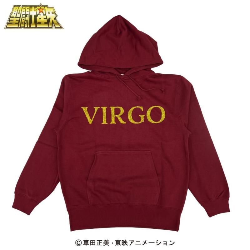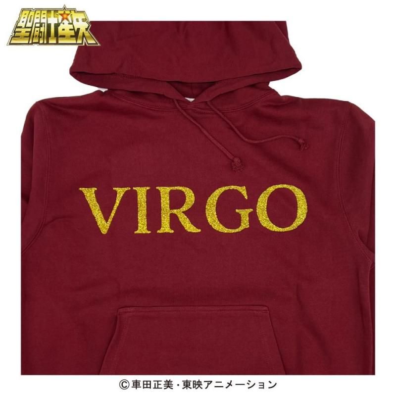 フロントにはシンプルかつ高級感のある「VIRGO」の文字をゴールドラメで刺繍風にデザインし、後ろには鮮やかな黄金聖衣をまとったシャカの雄姿を大胆にプリント。背面上部の「乙女座」の漢字も、和のエッセンスと迫力を同時に演出しています。