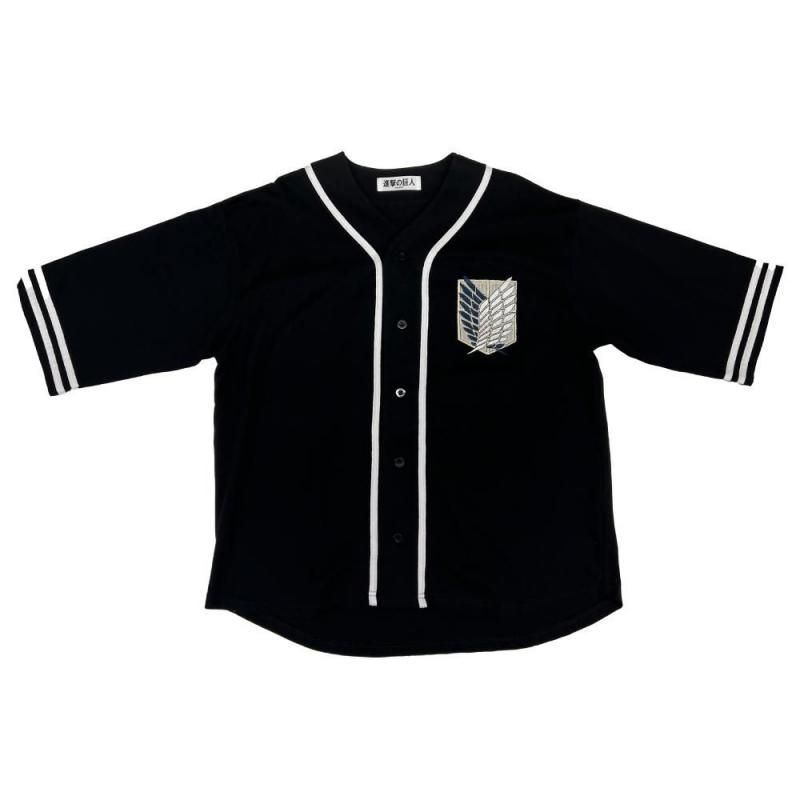 フロント左胸には、調査兵団の象徴である「自由の翼」を上質な刺繍で丁寧に再現。シャープなシルバーとネイビーのコントラストが際立ち、着るだけで物語の世界観を纏える仕上がりです。ボタンフロントとパイピングラインが、クラシカルなベースボールスタイルを演出しつつも、アニメファンの心を掴むデザインに。