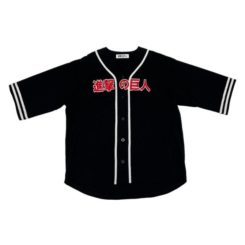 フロントには日本語ロゴ「進撃の巨人」が大きく刺繍され、クラシカルなベースボールシャツの雰囲気を活かしながら、アニメの世界観を存分にアピール。ブラックを基調にしたボディに赤と白の刺繍が映え、洗練された存在感を放ちます。